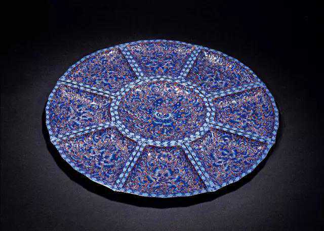清中期的攒盘有此盛景,皆因皇帝喜好、百官争献之故。比如铜胎画珐琅攒盘多以色地装饰为主,即在黄地、蓝地、绿地上绘制图案和纹样;器物底部和口沿露出的铜胎线条,又常常镀金修饰;纹样题材多寓意吉祥如意、多福多寿。器物整体呈现华丽富贵、精致奢华的风格,但大多为宫廷制作,民间罕有流传。