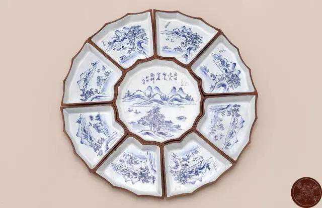 清外蓝釉内绿釉绘山水楼阁紫砂九子攒盘