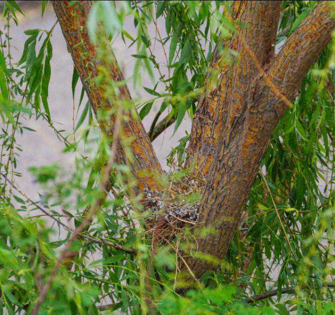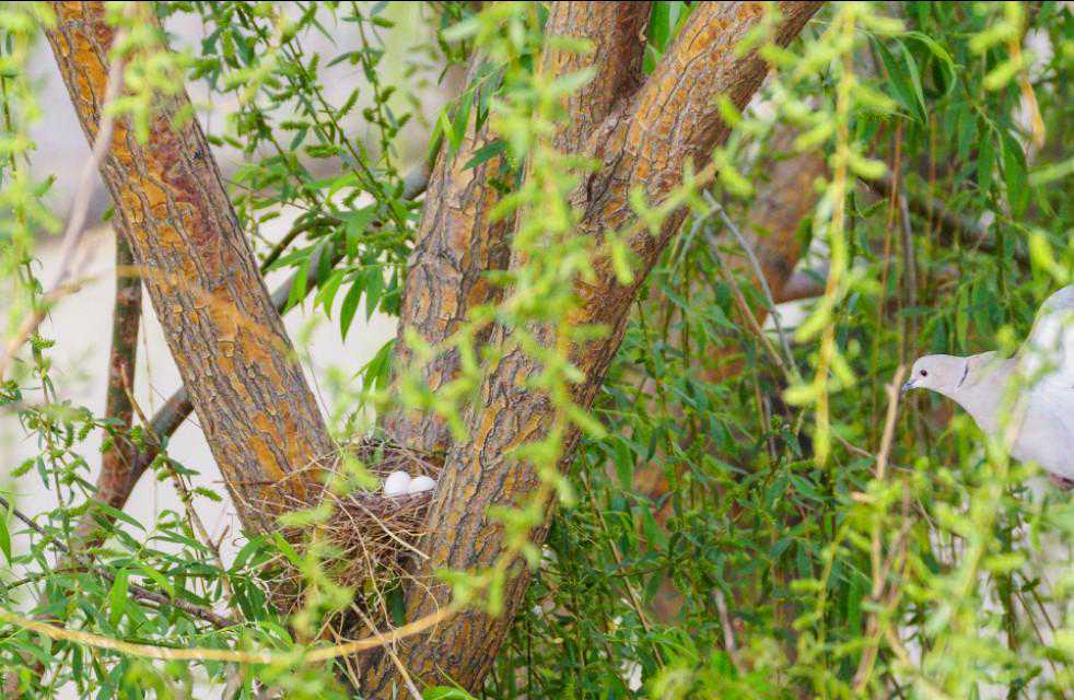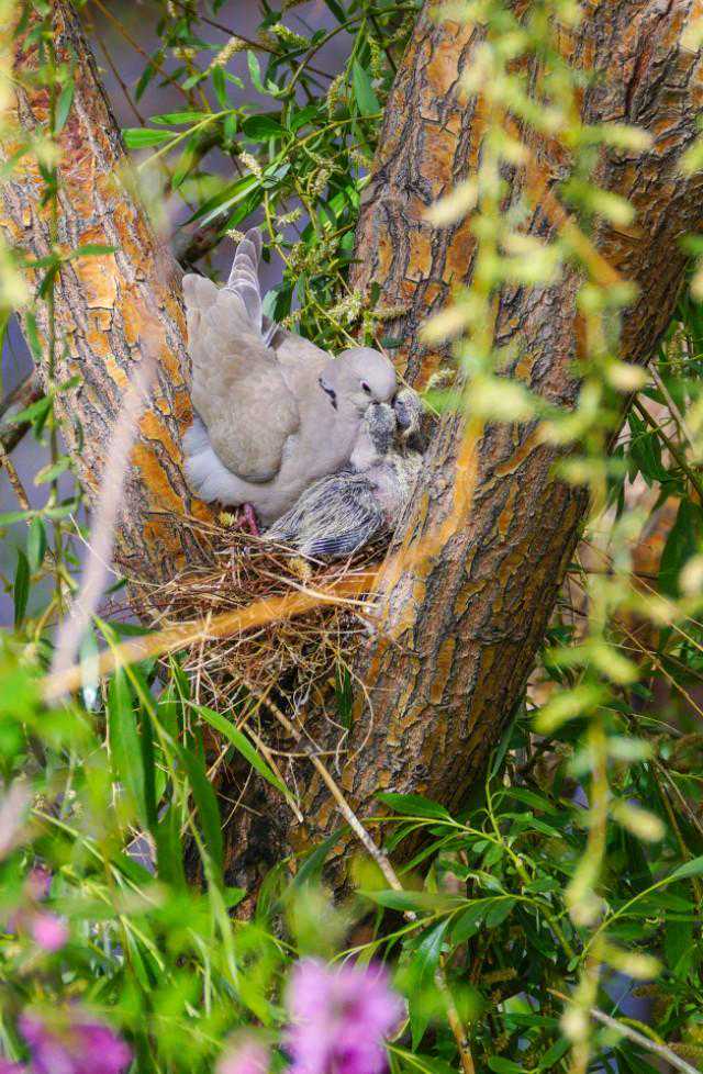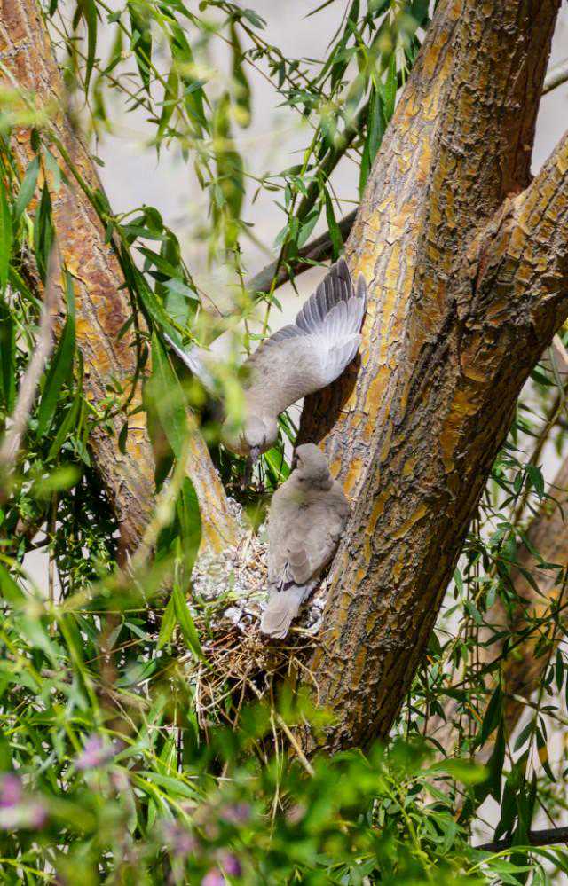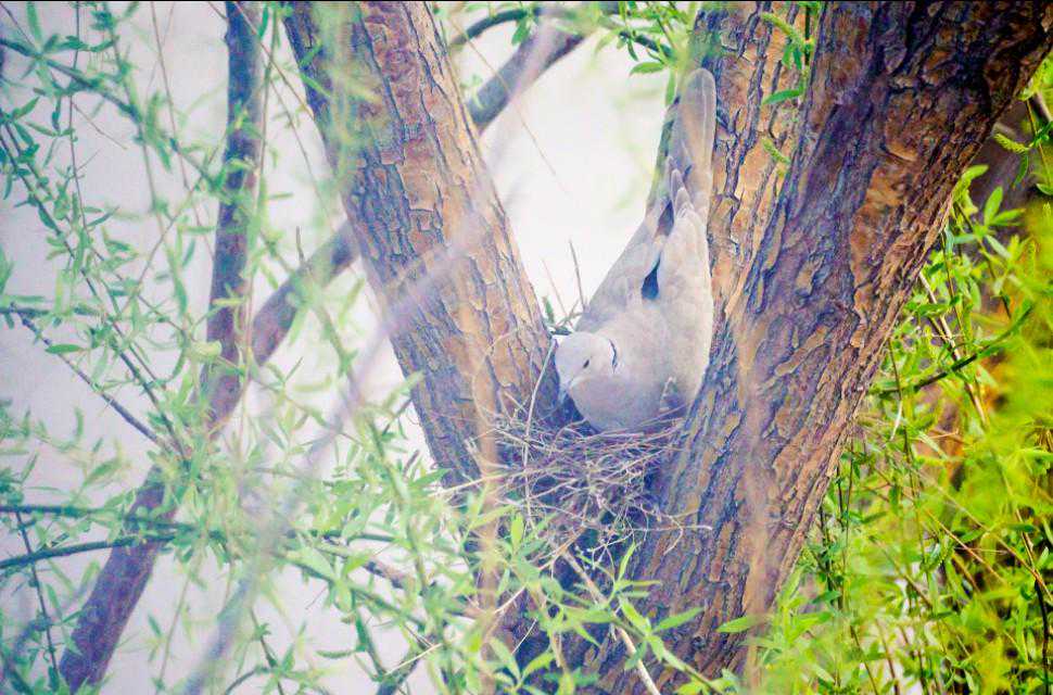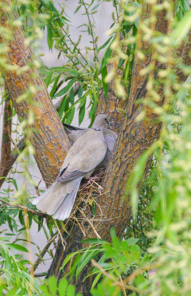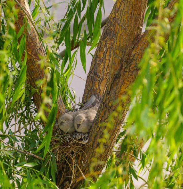24、5月16日下午,忽听外面巨大的轰鸣声,原来是物业找了两个人用油锯把小区里的树往倒放,说是因为低层的住户嫌树太高遮挡了家里的采光。都是长了十几年的和五楼一般高的垂柳,而斑鸠的家就在其中一颗的树杈上……大事不好!赶紧联系林业公安,他们来了后和两个砍树的先说明了情况,告诉他们斑鸠是国家二级保护动物,然后又联系了物业的负责人,请他们配合,先别砍这片树林,等小鸟出窝再回来施工。感谢林业公安,感谢物业的配合,小鸟的家保住了,可以继续愉快地成长了……
