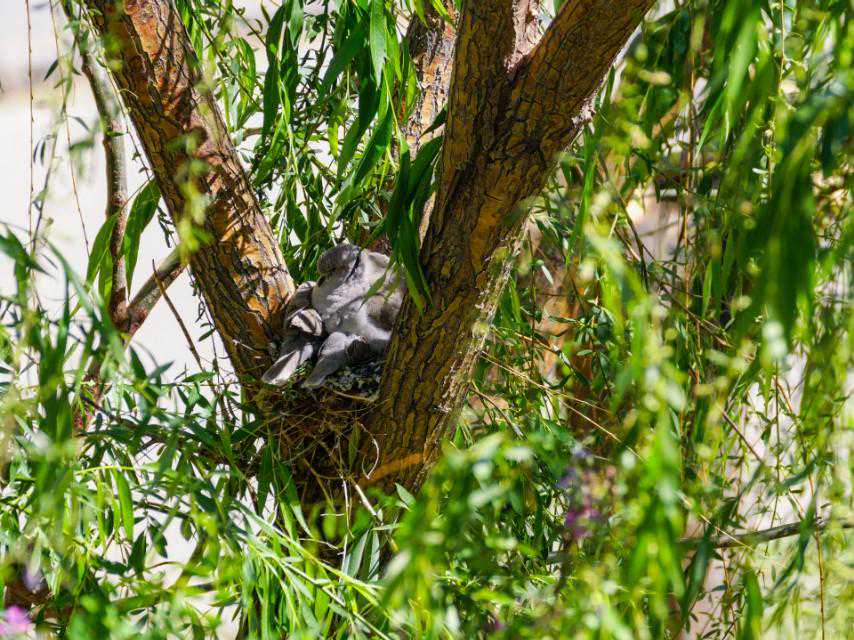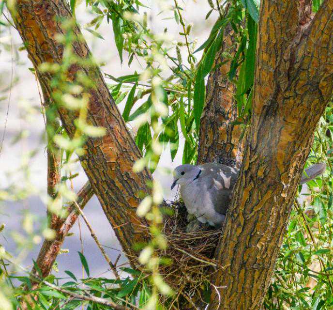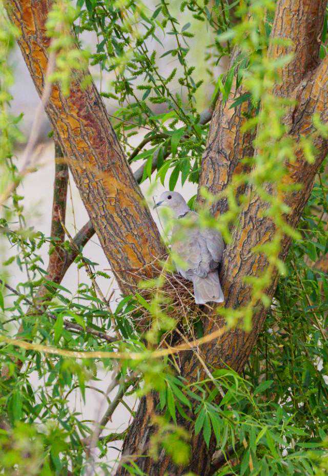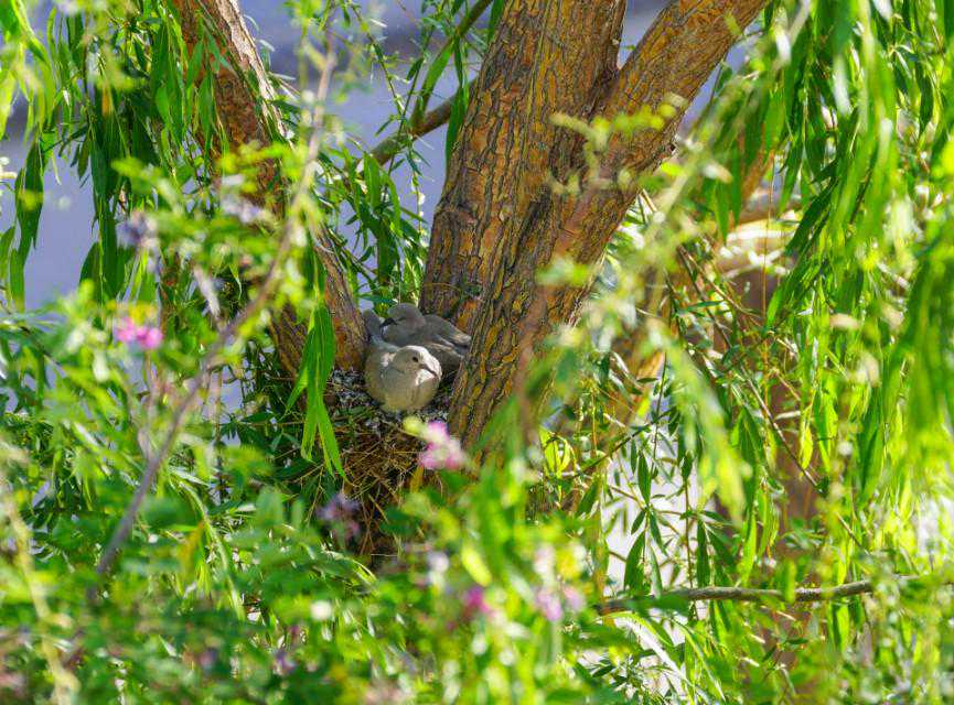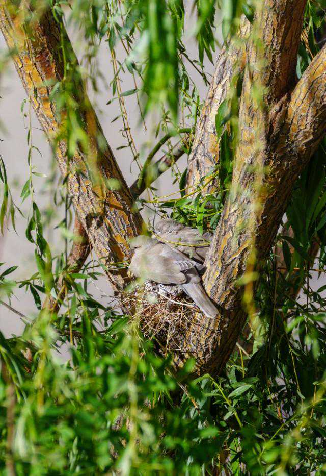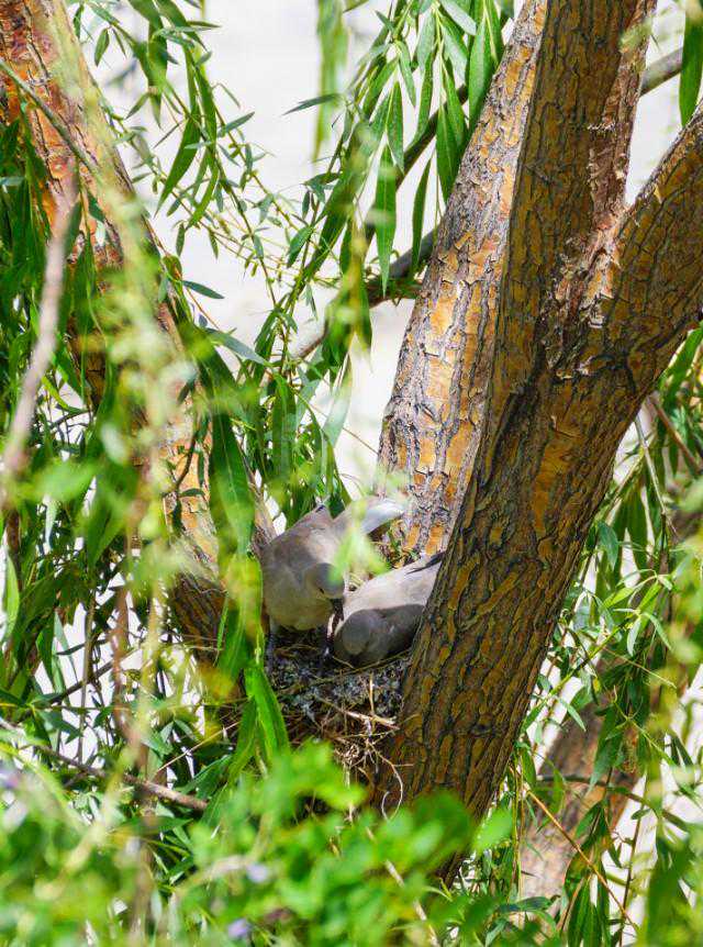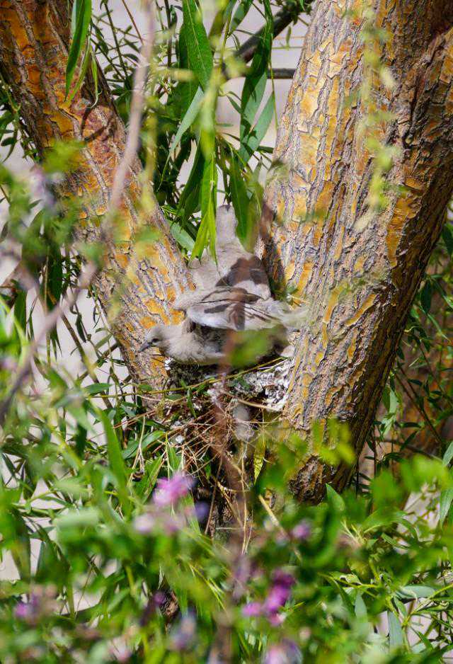 24、5月16日下午,忽听外面巨大的轰鸣声,原来是物业找了两个人用油锯把小区里的树往倒放,说是因为低层的住户嫌树太高遮挡了家里的采光。都是长了十几年的和五楼一般高的垂柳,而斑鸠的家就在其中一颗的树杈上……大事不好!赶紧联系林业公安,他们来了后和两个砍树的先说明了情况,告诉他们斑鸠是国家二级保护动物,然后又联系了物业的负责人,请他们配合,先别砍这片树林,等小鸟出窝再回来施工。感谢林业公安,感谢物业的配合,小鸟的家保住了,可以继续愉快地成长了……