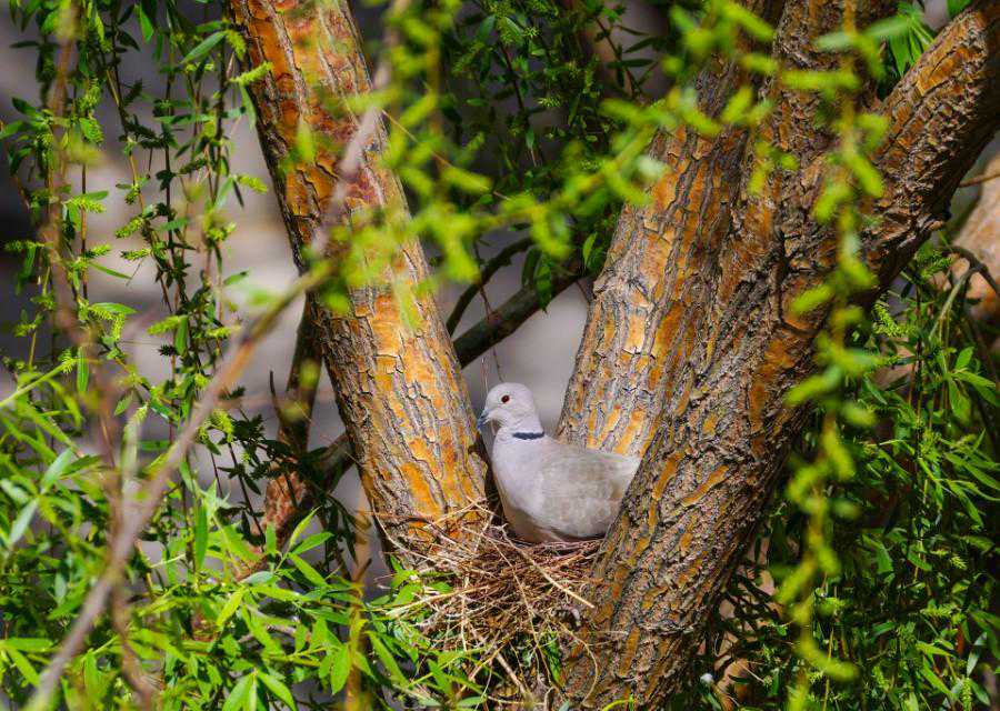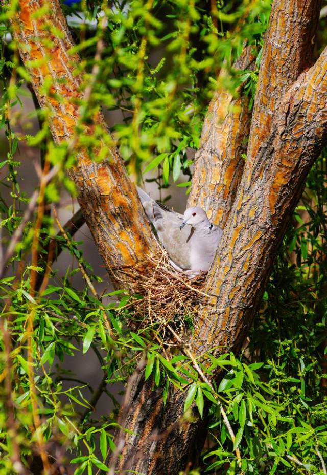 12、5月9日,鸟爸爸又叼回细树枝和干草,和鸟妈妈一起加固鸟窝,莫不是小鸟要出生了?百度了一下,斑鸠的孵化期是14-18天,从4月22日算起,到今天是17天。