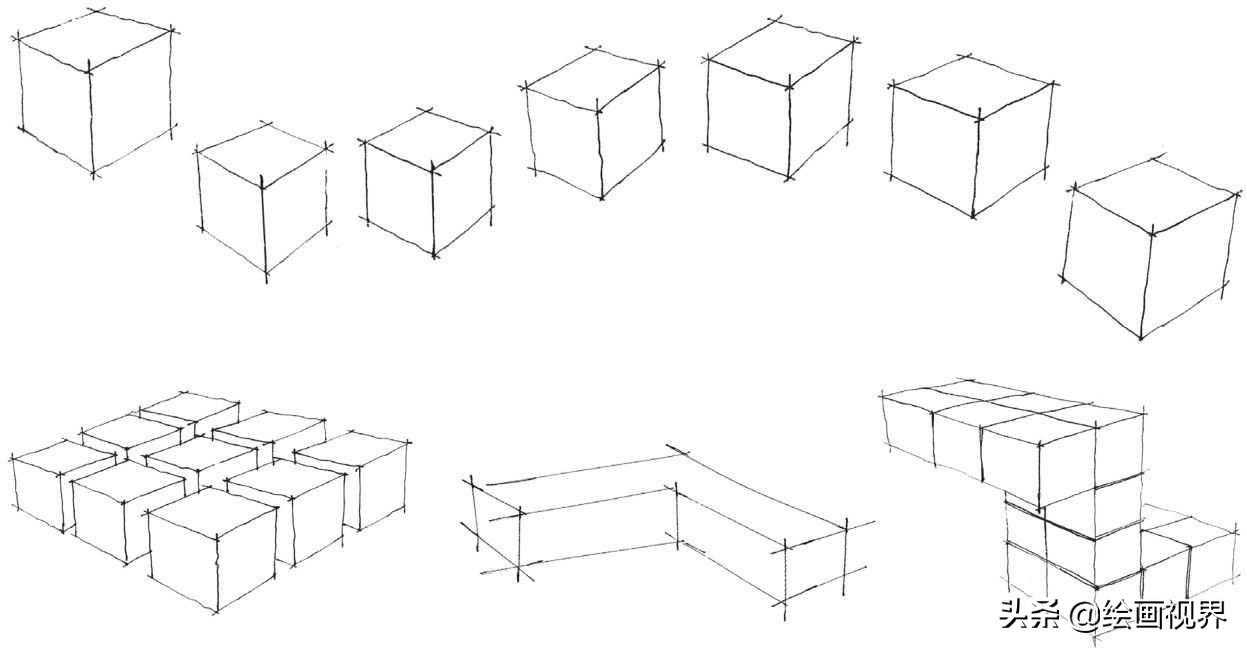 几何形体空间表现可以是一种形体元素的阵列与叠加,也可以是不同形体元素的穿插、咬合、叠加与搭接等,在绘制不同形体元素时要考虑不同形体的透视关系。下面列举了一些几何形体在空间中组合的物体。
