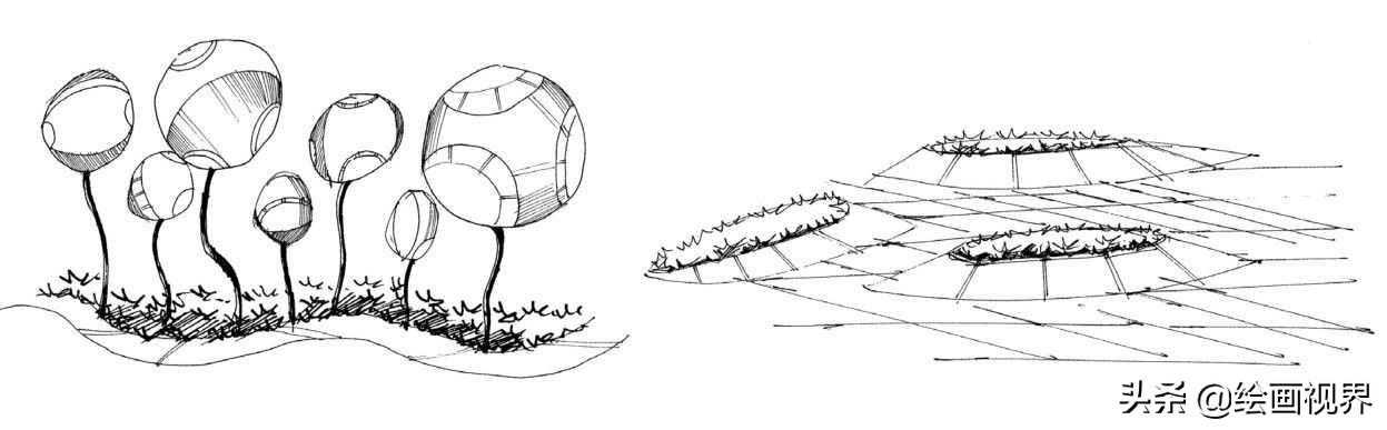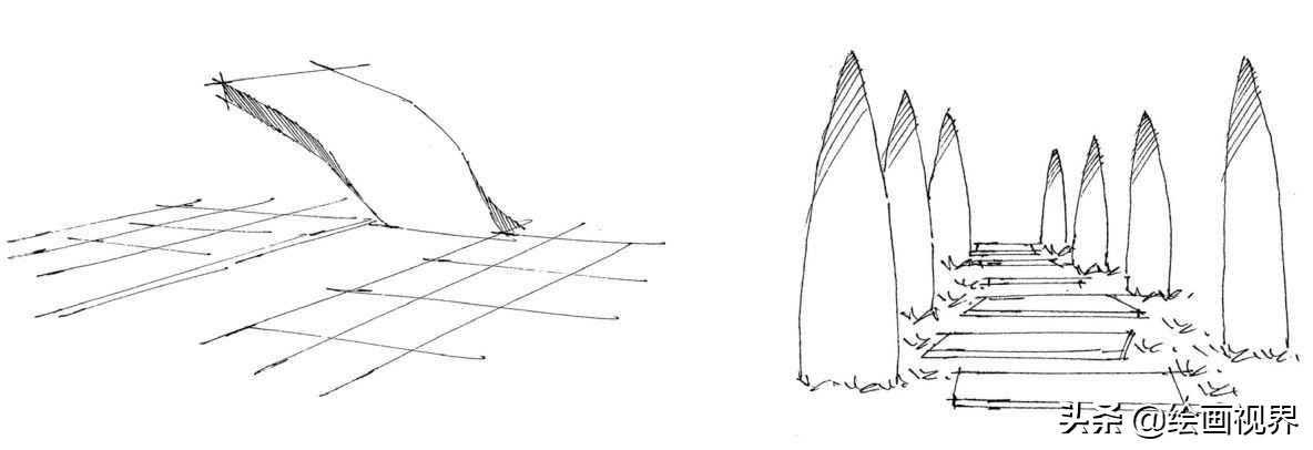 景观形体绘画训练是艺术家对自己所积累素材的一个展示过程,它能很好地体现艺术家的思想,能够加深对不同景观的认识以及综合性体现自然元素提取的过程。绘画并不是凭空想象,所有的造型与创意通常都是通过对某一事物的认识与抽象提炼而产生的。