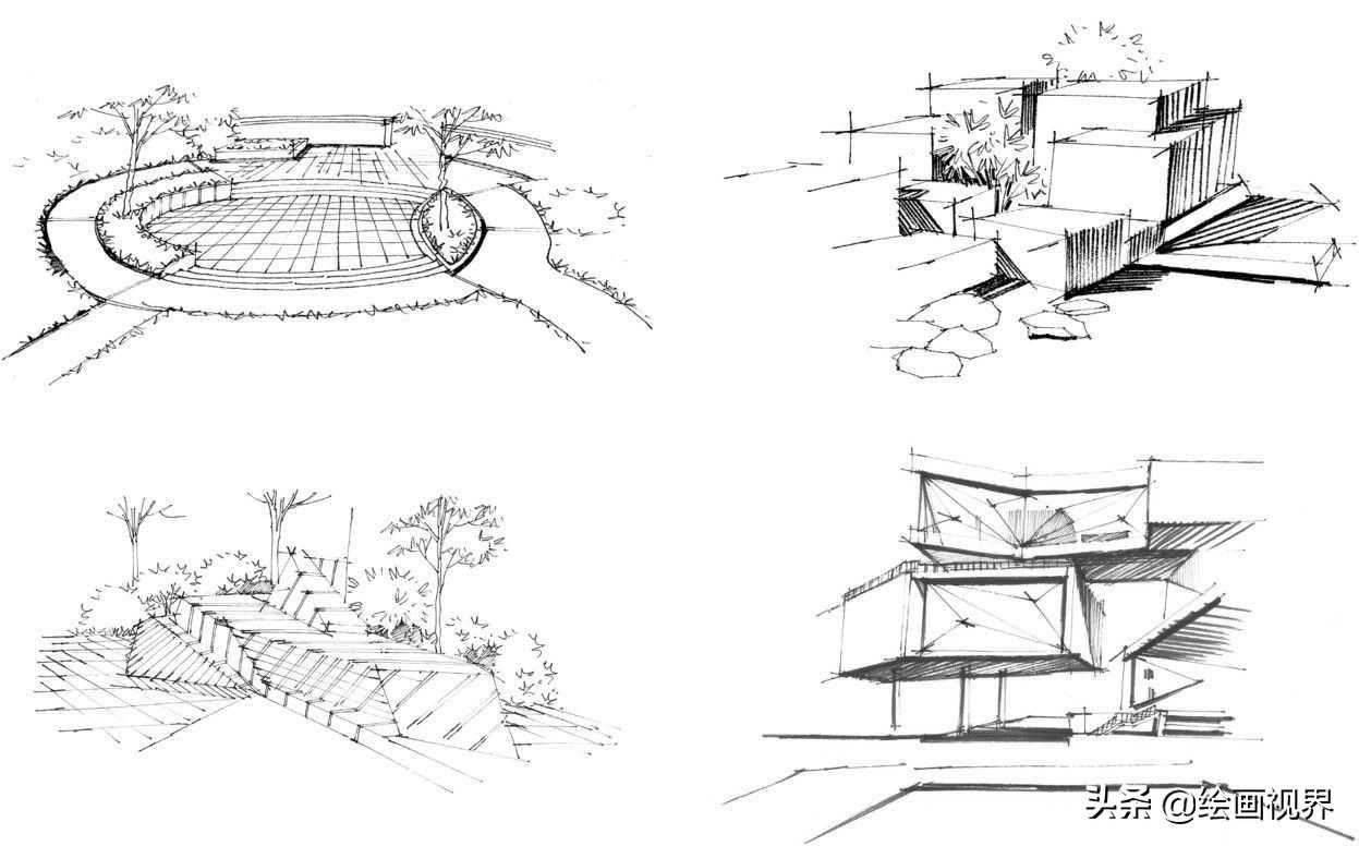 几何形体创意空间表现,主要是通过几何形体的抽象演变形成我们想要的一些造型元素,并为设计所用。在绘画时不要局限于具体的一些表象功能,要思考所表现的物体有没有可能用于其他领域,如喷水构筑物造型也可以将其改变成室外灯具以及廊架等,建筑体也可以通过体量的改变形成种植池与景观小品等。但同时要注意这些元素的变化,要和整体景观与建筑风格相协调。因此,景观设计手绘是充满想象力与创造性的。我们在绘画的过程中要多思考、多体验,才能让我们的设计更有创造性。