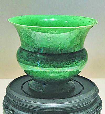 瓜皮绿釉锥拱云凤纹渣斗(陶瓷)