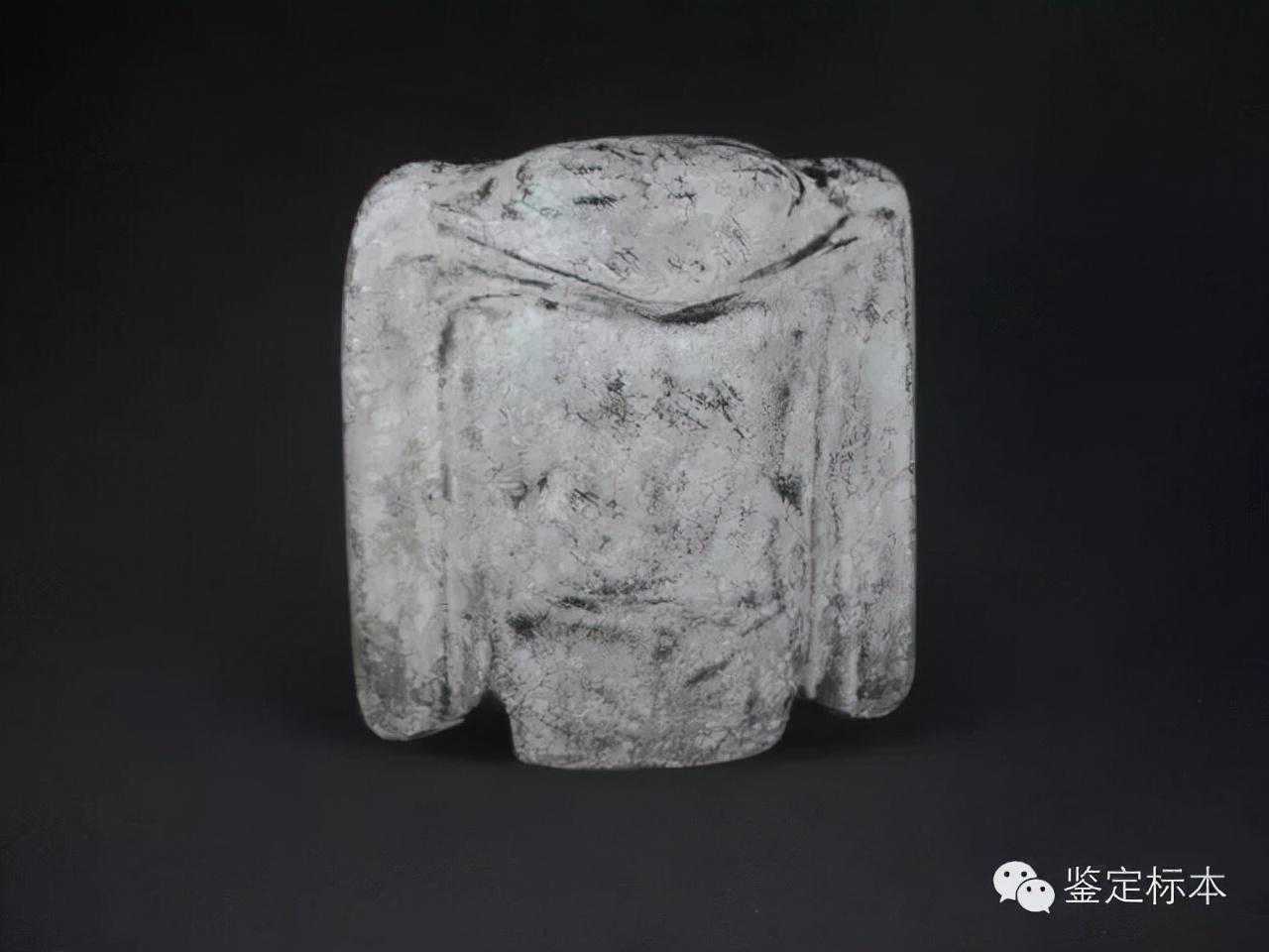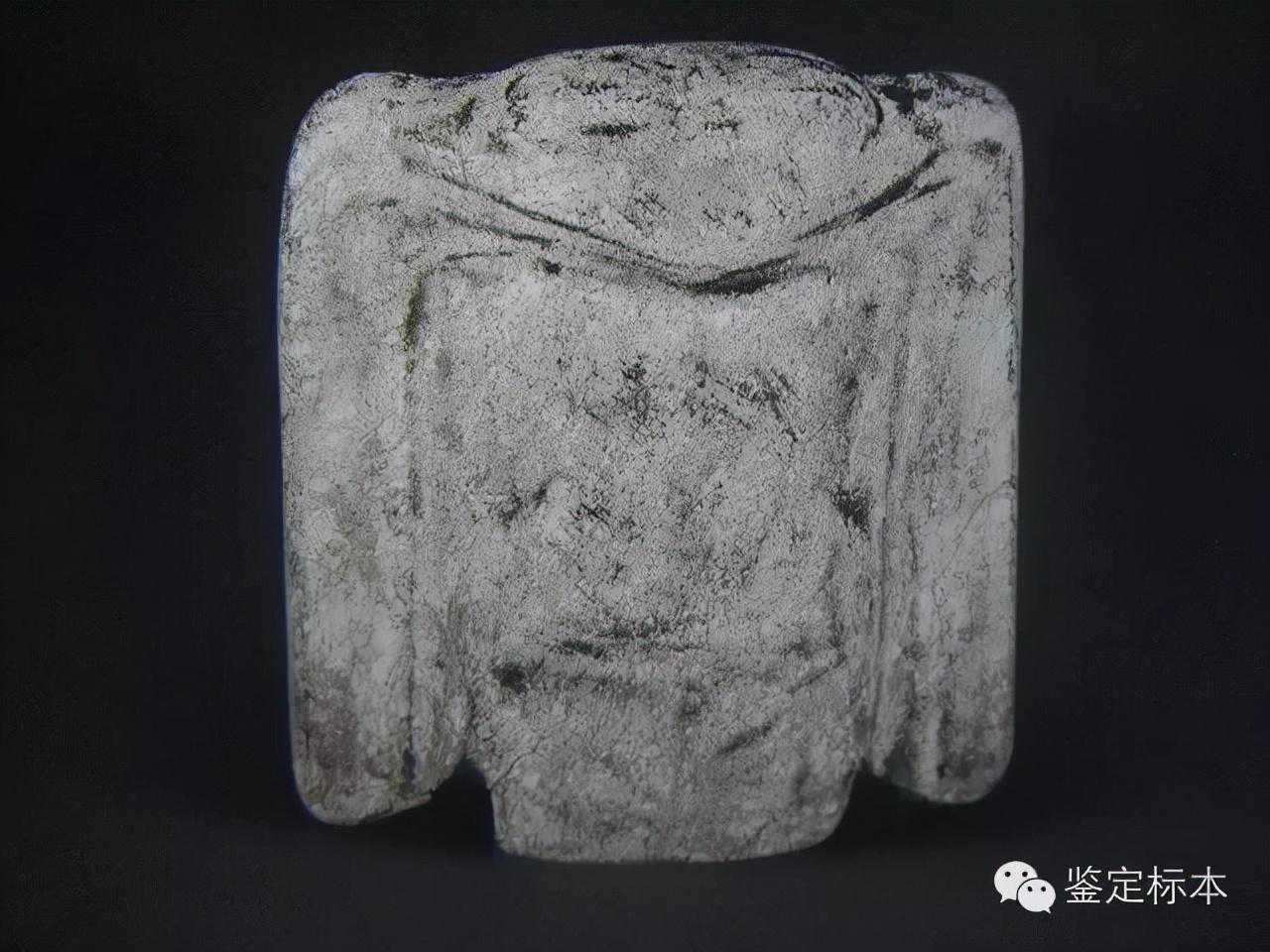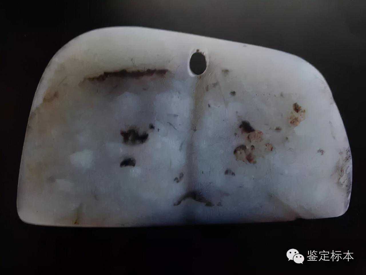表面拋光痕嚴重的痕跡模糊,其它痕跡相對完整。綹裂的邊緣腐蝕形成塌陷,綹裂處邊緣自然的塌陷,是鑒定玉器真偽的重要依據。內部的白化體現了玉器腐蝕不均勻的規律。