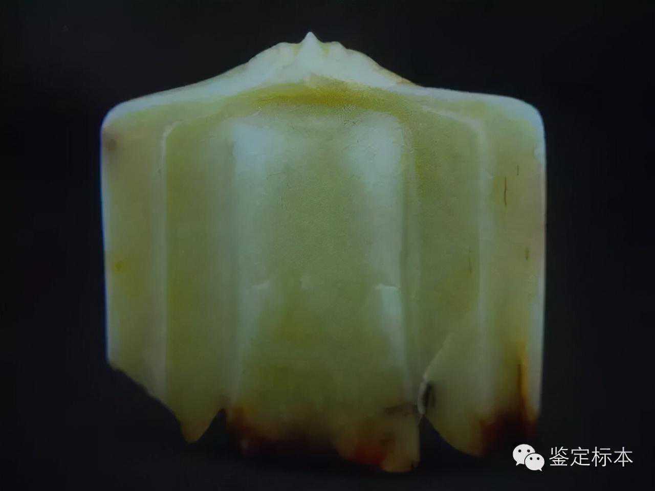 內部的白色,由外而內的黃色、褐色,深入玉質內部,分佈自然,非常內在,內部的玉質白化與透明成分交織自然,白化成分與表面黃褐色過渡自然,變化豐富。對沁色的把握,只能依賴長期的積累,這正是一個鑒定家應有的素養。