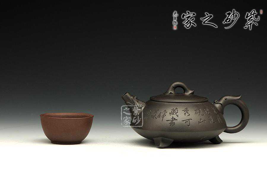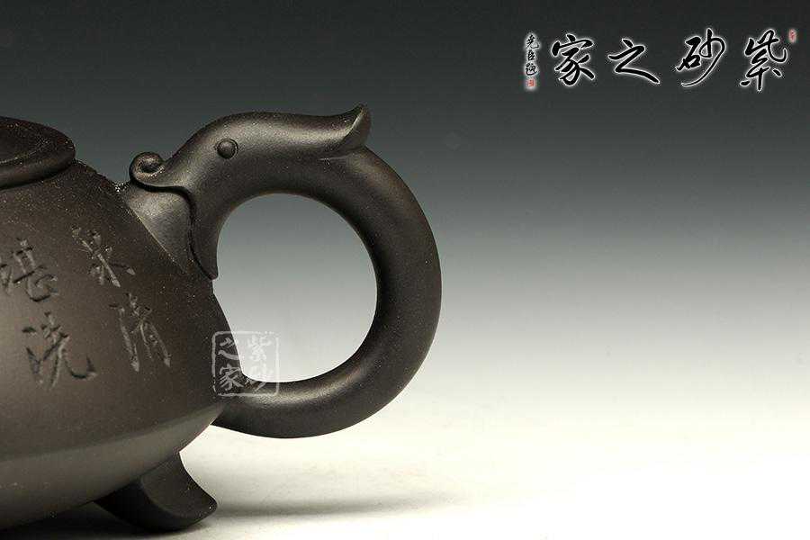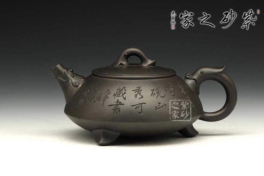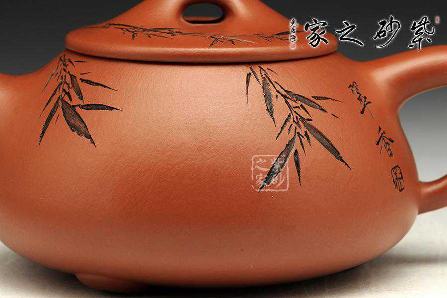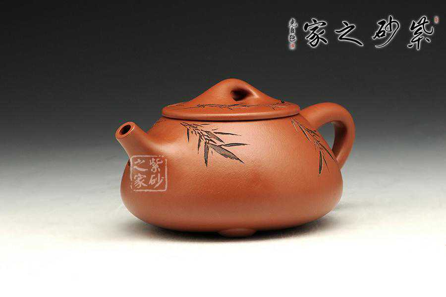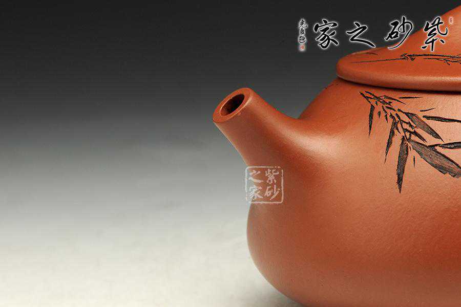 此壶为经典的石瓢造型,上敛下丰,整体比例匀称,器型优美。壶身以圆弧线条构成,流、把、钮处处衔接自然流畅,线条清爽利落,起承转合自如得体。壶嘴、壶把、壶身三位一体。底部三圆足立起全身,使壶显得挺括有神,展露出一种大气风范。壶身上刻有片竹叶,生机勃勃,寓意竹之坚强不屈的高尚品格;在壶身反面,几个刚劲有力的刻字,刀法刚劲有力,文化韵味十足。