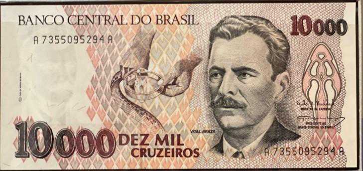 巴西许多地方的气候温暖湿润,适宜于蛇生活,所以巴西的蛇很多。这张纸币的图案是一条大蛇正在吞食另一条小蛇。