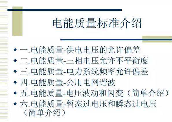 其可以定义为:导致用电设备故障或不能正常工作的电压、电流或频率的偏差,其内容包括频率偏差、电压偏差、电压波动与闪变、三相不平衡、暂时或瞬态过电压、波形畸变(谐波)、电压暂降、中断、暂升以及供电连续性等。
