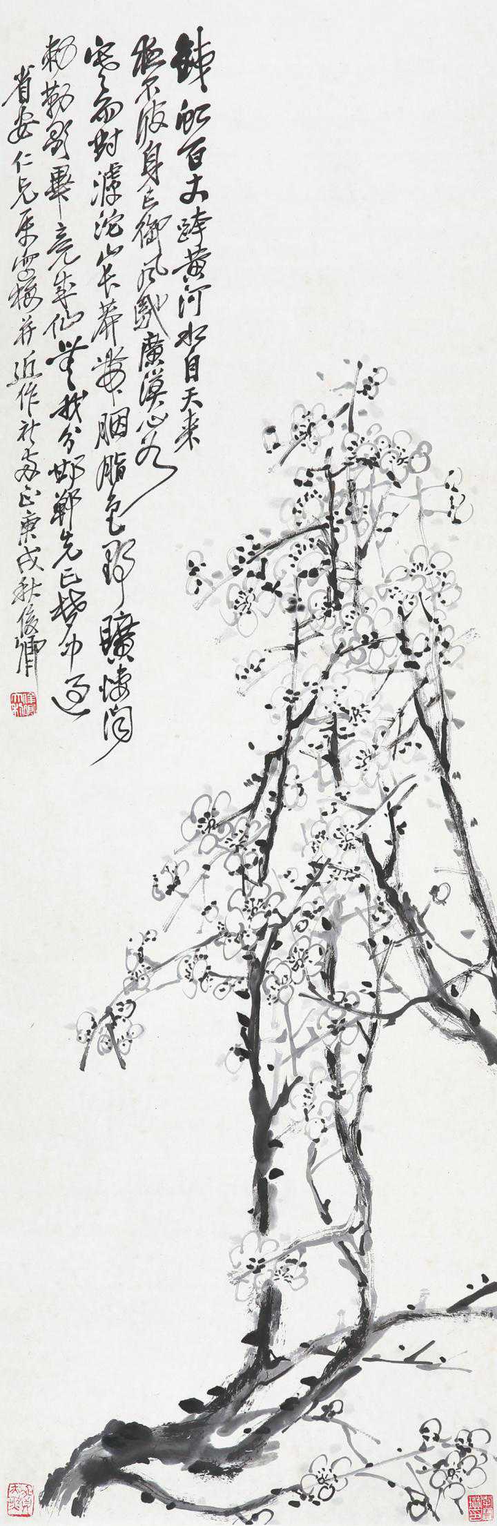 题识:铁虹百丈跨黄河,水自天来夜不波。身已御风驰广漠,心如寒雨对滹沱。山长莽带胭脂色,野旷凄闻勅勒歌。毕竟成仙无我分,邯郸先已梦中过。省安仁兄属写梅并近作祈两正。庚戌秋,俊卿。