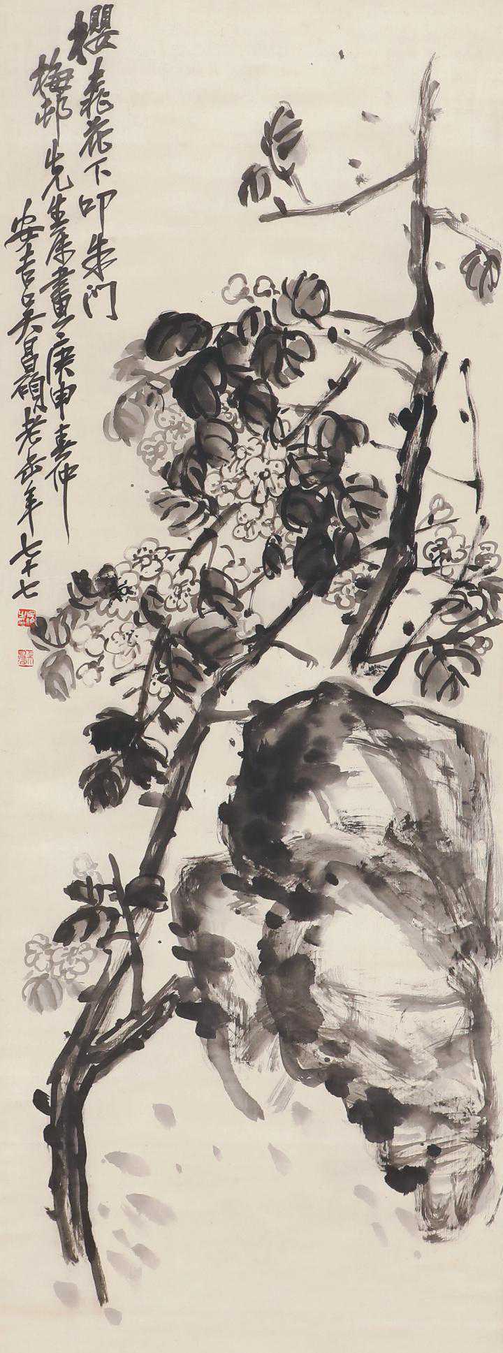 题识:樱桃花下叩朱门。梅邨先生属画。庚申春仲,安吉吴昌硕,年七十七。