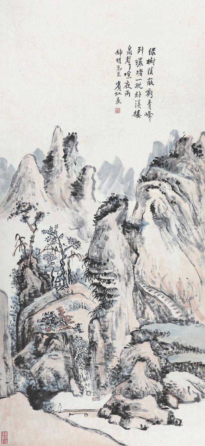 题识:绿树阴蔽#,青峰到环堵。一枕卧溪楼,泉声喧夜雨。叔明先生,宾虹画。