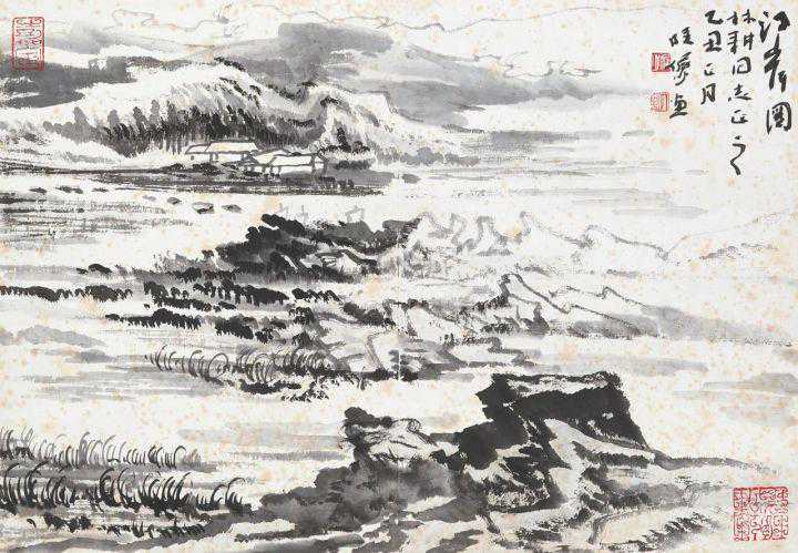 题识:江岸图。林耕同志正之。乙丑正月陆俨少画。