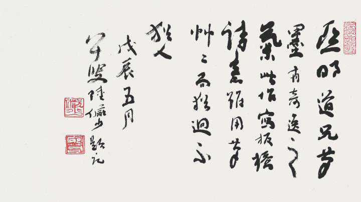 陆俨少题诗堂:亚明道兄笔墨有奇逸之气,此作写板桥诗意,虽用笔草草而犹迥不犹人。戊辰五月八十叟陆俨少题记。