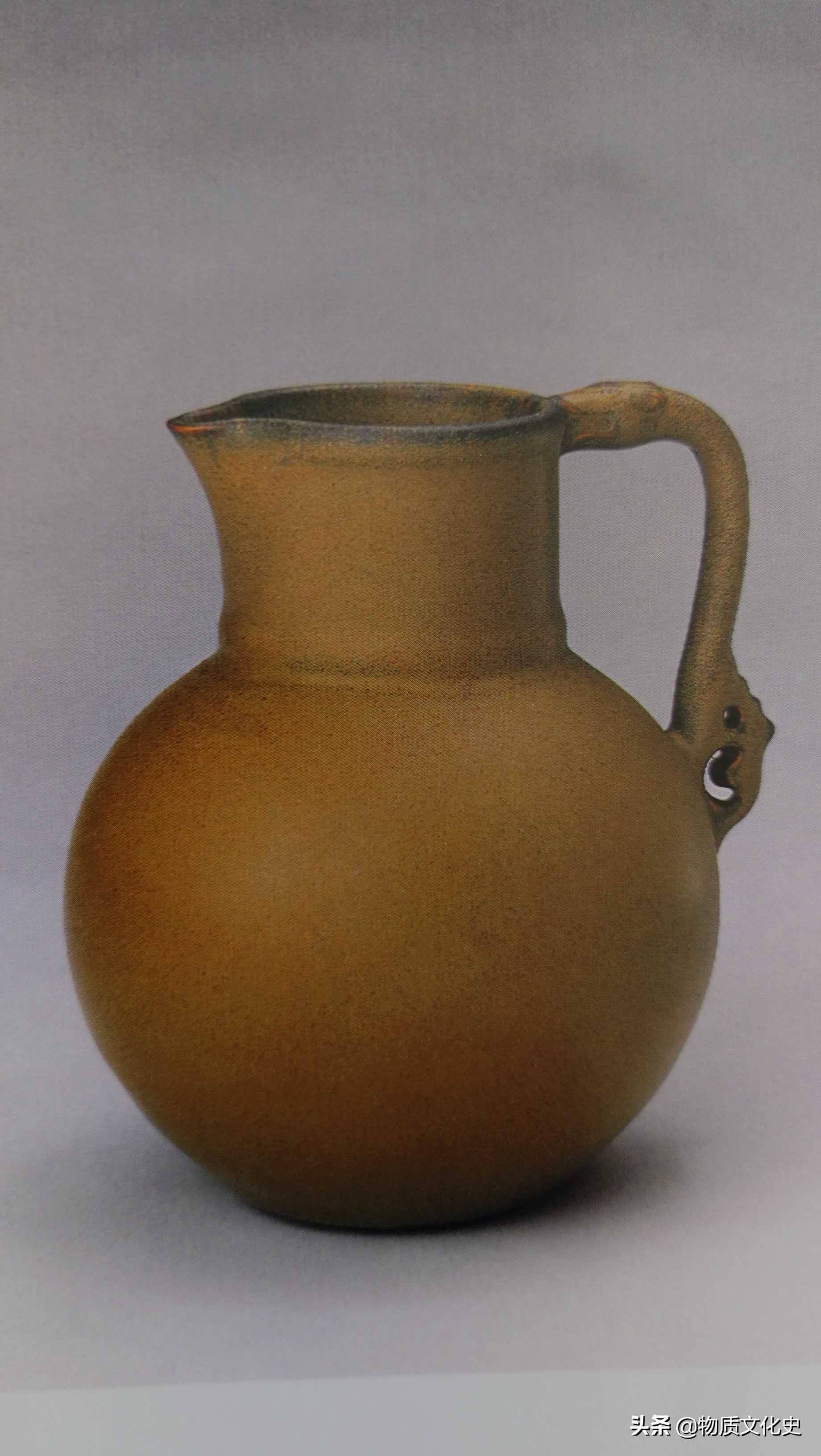 厂官釉花浇,清乾隆时期所制,高17厘米,口径7.3厘米,足径6.5厘米。花浇唇口,一侧有流,直径,硕腹,圈足。口、腹之间安一龙形柄。通体及足内均施厂官釉。颈、肩相接处凸起弦纹一道。