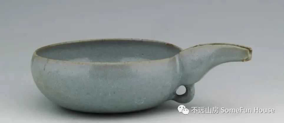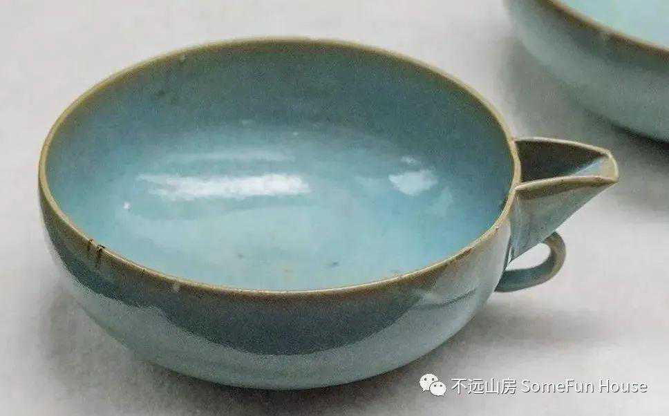 河南博物院藏金代钧窑月白釉单柄杯,金代,高7厘米,口径17厘米,1966年从开封市文物商店购买。尖唇,口微敛,浅弧腹,圜底,底部微凹。口沿一侧出菱式折沿,沿下有一环形耳与腹部相连。通体施月白釉,满釉支烧,外底有三个支烧痕。