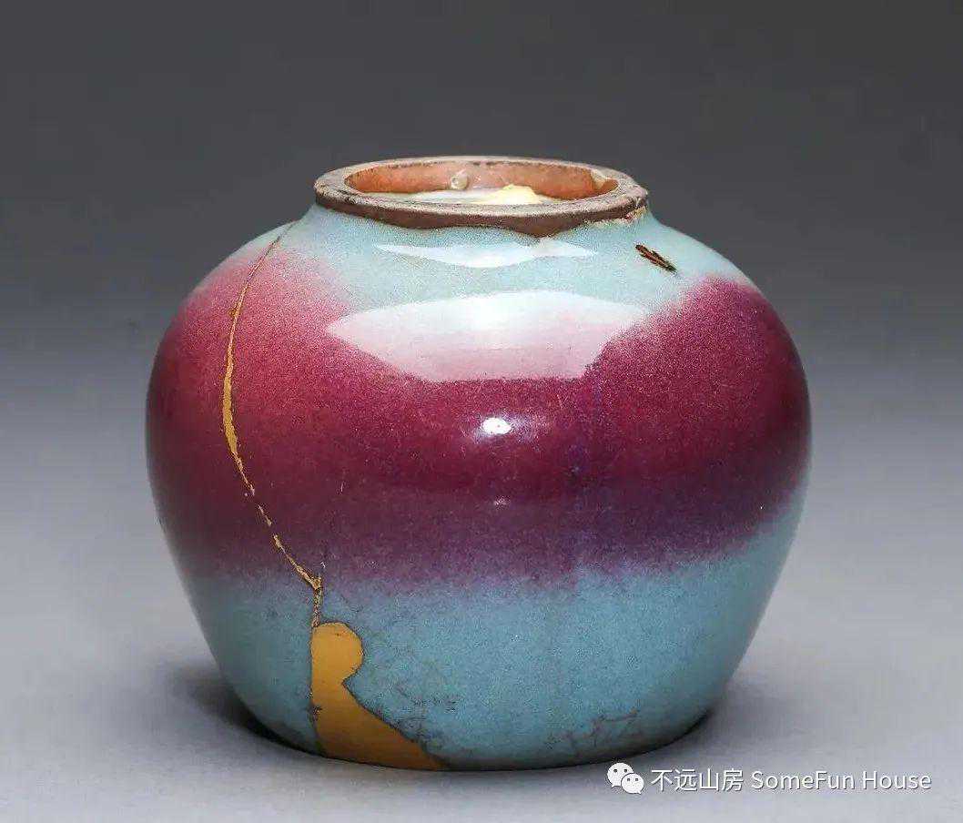 大都会艺术博物馆藏金代钧窑天青釉玫瑰红窑变鸡心罐