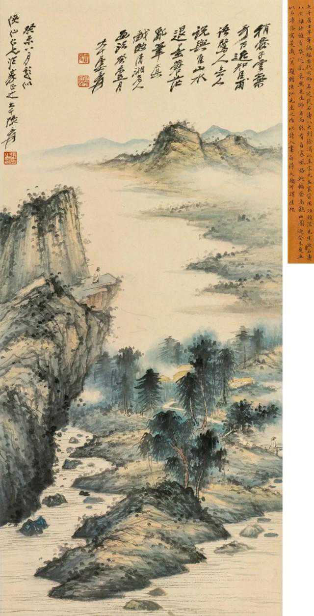 9.张大千摹石涛山水题识:夙有山水癖,无计能买山。乃时随意造,求之诸墨间。林边属气清,泉畔开松关,心静兴逾动,笔征趣自闲。清湘大涤子济,大千居士爰摹。
