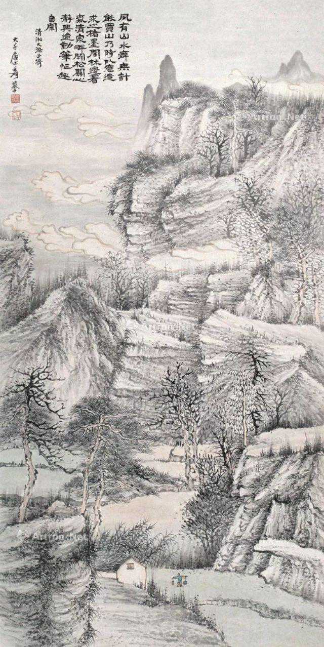 其山水布局基本忠于石涛原作,采用了高远和深远相结合的缜密构图,保留了原作的恢弘气势和静谧清寂、可居可游的气氛,尽得石涛山水画的艺术精髓。