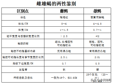 四、蝎子的雌雄鉴别一般情况下,雌雄蝎的区分没有太大的意义,因为它们在入药、取毒方面没有明显差异,但在进行引种时,雌雄鉴别就显得十分有必要了。成蝎的两性差异较为明显,在进行雌雄鉴别时,可以根据以下外形特征加以区别比对。